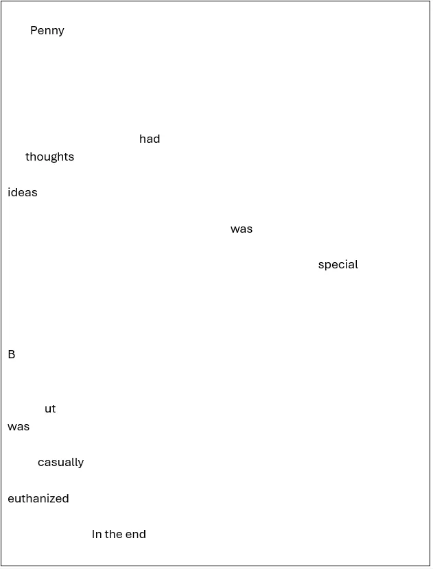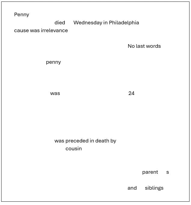 For a different take on the demise of Penny, look at the source material, The Penny Dies at 232, which was erased then compressed for this poem.