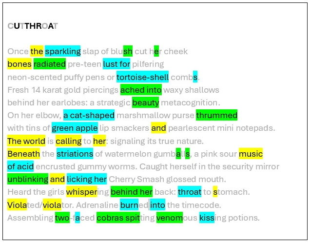 The source material is “Cutthroat” by my friend and collaborator the poet MK Francisco. What collaboration, you ask? Stay tuned. And stay patient.